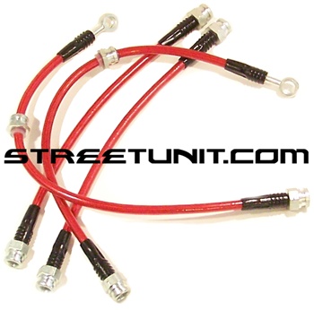 This stainless steel braided brake line kit comes complete with new banjo bolts and washers. The threaded hardline head is also on a swivel, so you never have to twist the line to thread it to the hardline.